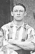 Archie Mitchell took over as player-manager during the 1921 off-season and buoyed by Harry Morris' 17 goals, Brentford finished 9th in 1921–22,[33] but it proved to be a false dawn, with the triple-departure of Alf Amos, Harry Anstiss and George Pither to Millwall in 1922 and Morris' and captain Bertie Rosier's subsequent departures in February 1923 precipitating two mid-table finishes.[34] A dire opening to the 1924–25 season led Mitchell to step down in December 1924,[33] with Fred Halliday assuming the manager's job for the third and final time and being forced to sue for re-election at the end of the season.[35] Halliday remained in charge for 1925–26, which despite an 18th-place finish and a club-record 94 league goals conceded,[33][36] promised much for the future with the breakthrough of forwards Ernie Watkins, Jack Lane and Alfred Douglas.[37] In 1925, Brentford's white shirts were changed to the traditional red and white stripes.[20]