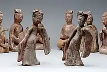 Many dances of this period are mentioned in historical texts. In one account, a sword dance was said to have been performed by Xiang Zhuang at a banquet in an attempt to assassinate Liu Bang (the founder of the Han dynasty) at the Feast at Hong Gate.[20] This event forms the basis of the "Gong Mo" Dance (公莫舞) – "Gong Mo", literally "Sir, Don't!", which describes the blocking actions by Xiang Bo during the sword dance to prevent Xiang Zhuang from thrusting his sword towards Liu Bang.[21] The "Gong Mo" Dance was later known as the Scarf Dance (巾舞). The dance is performed with a long scarf held in each hand, and is similar to today's Long Silk Dance. Liu Bang was also said to be fond of the war dance of the Ba people, called the Bayu (巴渝) dance and known in later eras in various names such as Zhaowu (昭武) in the Eastern Wu period and Xuanwu (宣武) during the Jin dynasty. Large-scale performances of this dance involved brandishing weapons to the accompaniment of drums and songs in the Ba language.[22]