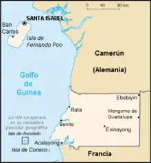 From 1827 to 1843, the United Kingdom had a base on Bioko to suppress the transatlantic slave trade,[3] which was then moved to Sierra Leone upon agreement with Spain in 1843. In 1844, on restoration of Spanish rule, it became known as the "Territorios Españoles del Golfo de Guinea". Spain had neglected to occupy the large area in the Bight of Biafra to which it had treaty rights, and the French had been expanding their occupation at the expense of the area claimed by Spain. The Treaty of Paris in 1900 left Spain with the continental enclave of Rio Muni, a mere 26,000 km2 out of the 300,000 stretching east to the Ubangi River, which the Spaniards had claimed.[4]
