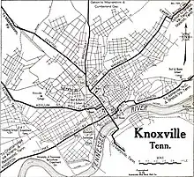 The History of Knoxville, Tennessee, began with the establishment of James White's Fort on the Trans-Appalachian frontier in 1786.[1] The fort was chosen as the capital of the Southwest Territory in 1790, and the city, named for Secretary of War Henry Knox, was platted the following year.[1] Knoxville became the first capital of the State of Tennessee in 1796, and grew steadily during the early 19th century as a way station for westward-bound migrants and as a commercial center for nearby mountain communities.[1] The arrival of the railroad in the 1850s led to a boom in the city's population and commercial activity.[1]