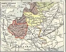 In 1335 John of Bohemia renounced his claim in favour of Casimir the Great, who in return renounced his claims to Silesia.[43] This was formalized in the Treaty of Trentschin and Congress of Visegrád (1335), ratified in 1339[44] and later after Polish-Czech war confirmed in the 1348 Treaty of Namslau. As a result, the Polish kingdom renounced any claims to Silesia "for all future times", making the border between the Holy Roman Empire and hence the Germanosphere in Silesia one of the longest lasting borders in Europe.[45] Since 1512, the Empire was often termed the Holy Roman Empire of the German Nation, which paralleled the rise of the concept of a German nation.[46]