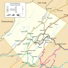 At the beginning of the 20th century, the Delaware, Lackawanna and Western Railroad opened a 400-mile (645 km) mainline that ran from Hoboken, New Jersey, to Buffalo, New York. A segment of this line called the Lackawanna Cut-Off (also known as the New Jersey Cut-Off, the Hopatcong-Slateford Cut-Off, the Lackawanna Highline, or simply the Cut-Off) was built across the southern portion of Sussex County from 1908 to 1911. It was in operation until 1979 and abandoned four years later.[16] This route is being rebuilt and is scheduled to begin operating in 2014 under the management of New Jersey Transit. The Cut-Off ran west from Port Morris Junction—near the southern tip of Lake Hopatcong in New Jersey, about 45 miles (72.4 km) west-northwest of New York City – to Slateford Junction near the Delaware Water Gap in Pennsylvania, a total of 28.45 miles (45.9 km).[17] The Lackawanna Cut-Off is an example of early 20th-century right-of-way construction, which minimized grades and curves and was built without vehicular crossings. It was one of the first railroad projects to use reinforced concrete on a large scale.