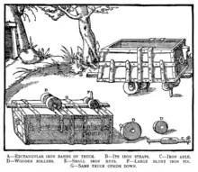 The earliest use of a railway track seems to have been in connection with mining in Germany in the 12th century.[2] Mine passageways were usually wet and muddy, and moving barrows of ore along them was extremely difficult. Improvements were made by laying timber planks so that wheeled containers could be dragged along by manpower. By the 16th century, the difficulty of keeping the wagon running straight had been solved by having a pin going into a gap between the planks.[3] Georg Agricola describes box-shaped carts, called "dogs", about half as large again as a wheelbarrow, fitted with a blunt vertical pin and wooden rollers running on iron axles.[4] An Elizabethan era example of this has been discovered at Silvergill in Cumbria, England,[5] and they were probably also in use in the nearby Mines Royal of Grasmere, Newlands and Caldbeck.[6] Where space permitted round-section wooden tracks to take trucks with flanged wheels were installed: a painting from 1544 by the Flemish artist Lucas Gassel shows a coppermine with rails of this type emerging from an adit.[7]