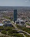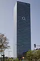 The building's glass facade wraps the structure of the building like a tensioned membrane. Circular ventilation elements in the form of individually opening windows enable natural ventilation and provide a reference to the outside world by making the background noise noticeable even on the upper floors. The tower with 50,200 m2 (540,000 sq ft) is flanked by four seven-storey buildings (approximately 8,525 m2 (91,760 sq ft) each) referred to as "campus" which are connected by a transparent roof. A fifth building houses 139 apartments.