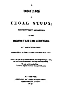 Originally published in 1817 as A Course of Legal Study; Respectfully Addressed to the Students of Law in the United States, the book was more commonly referred to as "Hoffman's Course of Legal Study".[1] Author David Hoffman released the book when there were 40 lawyers practicing in Baltimore[2] and shortly after founding the University of Maryland School of Law in 1816.[3] He republished the book in 1836 as A Course of Legal Study, Addressed to Students and the Profession Generally,[4] around the time he was losing interest in his law school and legal practice.[5]