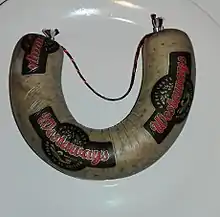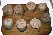 Hog's pudding is a type of sausage produced in Cornwall and Devon.[1] Popular variants of the recipe consist of pork meat and fat, suet, bread, as well as oatmeal or pearl barley formed into a large sausage—also known as 'groats pudding' and are very similar to a white pudding, whereas other versions of the recipe contain a high percentage of offal such as lung and liver and can more accurately be described as a sort of West Country haggis.[2] It is much spicier than white pudding as it contains black pepper, cumin, basil and garlic. The sausage is usually around two inches in diameter.