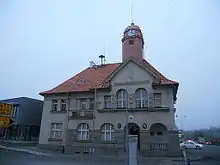 During World War II, Holýšov was occupied by Germany. The glassworks building was rebuilt to an ammunition factory.[2] In 1944, two subcamps of the Flossenbürg concentration camp were founded: one for French, Polish, Russian and Jewish women, and one for Polish, Jewish, Czech and Russian men.[3] The men's subcamp was presumably dissolved in January 1945, whereas the women's subcamp was liberated by Polish partisans in May 1945.[3] After the German occupation, the town was restored to Czechoslovakia.