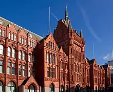 The building originally featured a library, restaurant, chapel, hall, rooftop promenade and a women's entrance.[6] It was electrically lit and featured hot running water.[6] The complex now encloses a courtyard, Waterhouse Square, named after the original architect.[5] The building was listed Grade II* on 3 March 1972.[5][7]