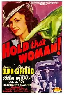 Hold That Woman! is a 1940 American crime comedy film directed by Sam Newfield and starring the husband-and-wife team of James Dunn and Frances Gifford. The film follows the adventures of a skiptracer and his girlfriend as they attempt to repossess a radio that has not been paid for. Unbeknownst to them, a bag of stolen jewels has been concealed inside the radio by a gang of criminals.