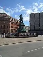 The large statue of Niels Juel was installed in 1881 to commemorate his achievements in the Battle of Køge Bay in 1677. It was designed by the sculptor Theobald Stein and cast in bronze. In 2002 the city council decided to move the statue to a new site on the waterfront to make way for a more efficient distribution of the traffic at its busy junction. This decision was met with severe criticism, including protests from the Royal Naval Museum, and in 2003 the Danish Heritage Agency decided to stop the move.[6]