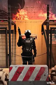 The second district is the Yellow Zone, which is the ghetto area where most of the population live. Patrols happen frequently and it is very difficult for the rebels to navigate. The cluttered city streets are awash with patrols, scanner drones, and ever-watching cameras. Power and water are intermittent and overpopulation has forced people into slum-like tent cities.[11] The Red Zone is the bombed-out suburban area of Philadelphia that is full of ruins and rubble; it is also where the resistance is at its strongest. While the KPA presence is still heavy, players will run into resistance troops, weapon caches, and traps set up to take out enemy patrols. The landscape is barren, though. Heavy shelling and frequent street battles have left most of the buildings in rubble and there is a constant haze of brick dust. It is the Forbidden Zone, so if the KPA catch anyone out there, they will shoot on sight — and call in back-up.[12]