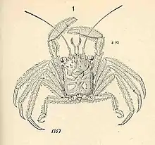 They usually have squarish carapaces with forward-pointing spines along the upper front edges.[2] The animal's chelipeds are shorter than their other legs (the back pair are short, thin and doubled back on themselves).[2] The animal's carapace grows to 2 inches (51 mm) long.[2]