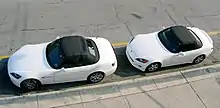 The 2008 model year marked the first time the S2000 was offered in more than one trim level in the United States.[19] In addition to the base model, Honda offered a more track-oriented version of the S2000, distinguished by reduced weight, fewer amenities, and an increase in performance. The S2000 Club Racer made its world debut at the New York International Auto Show on 4 April 2007.[20] Changes for the CR included a lower ratio steering rack, revised exhaust system, black lug nuts, darker colored wheels, clear side markers, stiffer suspension and new Bridgestone Potenza RE070 tyres that were 10mm wider at the rear (255/40R-17 vice the base model's 245/40R-17). A revised body kit, composed of a redesigned front lip, and a large spoiler, were wind-tunnel tested and claimed to reduce the overall coefficient of lift by 70–80%. The power folding soft top was removed and replaced with a Berlina Black hard top (regardless of the car's body paint colour), while the space into which the soft top would normally fold when lowered was filled with additional chassis bracing and topped off with a body-color tonneau cover. Honda also used a CR-unique yellow-lettered spherical aluminum shift knob which rests 12.6 mm lower than the base model's cylindrical shift knob (aluminum/leather wrapped). The CR knob provided a 6 percent reduction in shift stroke, and correspondingly presented a 10 percent higher shift load effort.