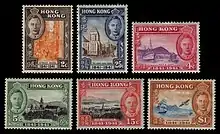 To mark the occasion, the Hong Kong Post Office issued a set of six commemorative stamps.[31][32] This set of stamps features various local sights and scenes to showcase the developments of Hong Kong as a British colony over the previous 100 years. The stamps were originally intended to be released in October 1940 but ultimately got published on 26 February 1941, exactly one month after the anniversary.[31][32]