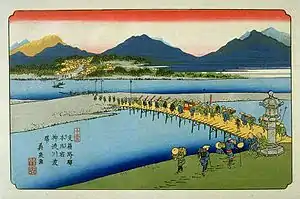 Keisai Eisen's ukiyo-e print of Honjō-shuku dates from 1835–1838. The print depicts the crossing of the Kanna River which marks the border between Musashi and Kōzuke Provinces. The time is dusk, and a daimyō procession with a closed palanquin is crossing a bridge, which only extends to a sand bank halfway across the river. As part of the Tokugawa shogunate's security precautions, the deeper part of the river is not bridged, but must be crossed by ferry. Large stone lanterns mark the crossing point. In the distance are the mountains of Mount Akagi, Mount Haruna and Mount Myōgi. The village on the other side of the river is the next shukuba of the Nakasendō, Shinmachi-shuku.