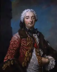 In 1750, as governor of Provence, he bought the Hôtel d'Esmivy de Moissac, a hôtel particulier on what is the Cours Mirabeau. The hôtel had been built in 1710 by Lois d'Esmivy de Moissac, councillor to the Cour des Comptes on a prestige parcel of land, meant since 1664 for a "hôtel du gouvernement". However the Duke of Vendôme, the Governor to whom the parcel was given, finally preferred the isolation of the faubourg des Cordeliers, where he built his Pavillon Vendôme.[3] The façade was completed in 1757, for the duke of Villars, by Georges Vallon : its four columns, surrounding a monumental entrance, were (with those of the Hôtel de Ville and University) the only ones that encroached on municipal space - the mark and privilege of the governor. Its staircase is adorned with the Villars coats-of-arms (stolen in 1980).[4] From then on it was known as the Hôtel de Villars.