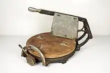 Hoop cheese was once so common that a device called a hoop cheese cutter was manufactured and used in general stores during the late 19th and early 20th centuries.[11] The hoop cheese cutter was patented in 1905 in the United States and resembled a turntable with a knife blade suspended above it.[12] It was built by scale companies of the period to cut to order the exact amount of cheese a customer wanted.[13]