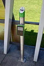 The Hop Card uses ISO 14443-compliant RFID technology allowing the card to be read/written without direct contact. The card uses the NXP/Philips MIFARE DESFire EV1 256B.[8] Hop Card readers can also read information from contactless bank cards and mobile wallets.[9]