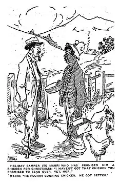 In the 1910s–1930s, Pākehā novels and editorial cartoons (e.g. in the Observer (1914) and New Zealand Truth (1922)) continued to degrade the unassimilated Māori for their laziness, stupidity and cunning.[7] During this period, published Pākehā folk humour, present in both fiction and cartoons, began to label unnamed Māori characters 'Hori'. By means of synecdoche, this resulted in the term Hori capturing the range of negative stereotypes ascribed to the Māori (e.g. poor, stupid, etc.), within fiction and public life, by the white majority at the time, eventually transforming the term into a universal racial slur. For example, the white author and journalist Patrick Lawlor (1893–1979), in the 1920s–1930s, wrote three collections of short stories focused on multiple stereotypical ‘Hori’ characters: namely, Maori Tales: A Collection of over One Hundred Stories (1926), More Maori Tales: A Collection of over One Hundred New Stories (1927) and Still More Maori Tales: A Further Collection of over One Hundred Stories (1930).[5] In the introduction of the first collection, Lawlor notes to the Pākehā reader that his main inspiration was the "guile and simplicity"[24] of the Māori; and that the broken or Pidgin English spoken by 'Hori' is "suffice to supply the necessary 'atmosphere'..."[24] of an authentic Māori character. The popularity of this genre of short stories helped to spread the racist "happy-go-lucky 'Hori' figure"[21] and related stereotypes throughout New Zealand society. For instance, it popularised the stereotype that Māori men wore poorly fitting European clothing with bare feet, because of their slovenliness and stupidity.