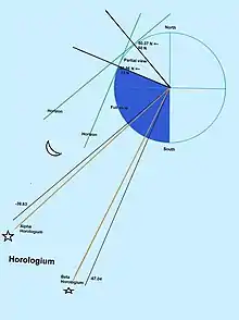 Covering a total of 248.9 square degrees or 0.603% of the sky, Horologium ranks 58th in area out of the 88 modern constellations.[7] Its position in the southern celestial hemisphere means the whole constellation is visible to observers south of 23°N.[7][lower-alpha 2] Horologium is bordered by five constellations: Eridanus (the Po river or Nile river), Caelum (the chisel), Reticulum (the reticle), Dorado (the dolphin/swordfish), and Hydrus (the male water snake). The three letter abbreviation for the constellation, as adopted by the International Astronomical Union in 1922, is "Hor".[8] The official constellation boundaries are defined by a twenty-two-sided polygon (illustrated in infobox). In the equatorial coordinate system, the right ascension coordinates of these borders lie between 02h 12.8m and 04h 20.3m , while the declination coordinates are between −39.64° and −67.04°.[9]