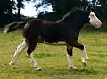 Foal growth leads to particularly rapid weight gain in the first few months. At birth, foals weigh 8 to 12 % of their mother's live weight. They double their birth weight during their first month of life. By the time they reach weaning age, at around 6 or 7 months, their weight has quintupled. By the age of one, they have reached around 65 % of their adult weight and 90 % of their adult height, which explains the often gangly appearance of foals at this age.[10] Draft foals fattened for slaughter weigh on average 59.3 % of the adult horse's live weight at 8 months, then 70.1 % at 12 months, and 90.1 % at 30 months.[2]