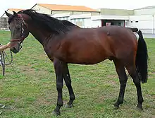 The horse body mass is always 65-75 % water.[1] The horse is considered a "thin animal" (with little fat), whose weight is divided into approximately 11 % bone, 50 % muscle and 9 % fat;[2] but a large number of factors influence its weight. Some breeds (draft horses) are naturally heavier than others (ponies), and differ in size and bone structure, so the weight range of horses is highly variable. Ponies can weigh less than 200 kg and heavy horses more than a ton,[3] while the average weight of a saddle horse is estimated at around 500 kg. Champion show-jumper Jappeloup de Luze, for example, weighed around 470 kg.[4] Heavy horses bred for slaughter reach particularly high weights, as it's in the breeder's interest to get maximum meat weight out of them.[5]
