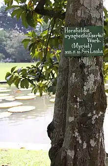 - Horsfieldia odorata (the type species for the genus Horsfieldia) was first described and published in Species Plantarum. Editio quarta 4(2): 872. 1806. It was later made into a synonym of H. iryaghedhi, but remains the type of record for Horsfieldia. "Name - !Horsfieldia Willd". Tropicos. Saint Louis, Missouri: Missouri Botanical Garden. Retrieved June 24, 2012.