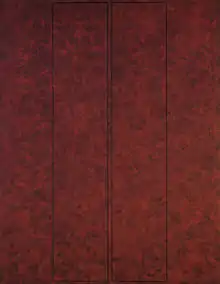In 1986, architecture again became the central theme of Keining’s painting. By this time, Keining was working at a larger studio. He created works in which the three-dimensional quality of the architecture is reduced to a flat depiction reminiscent of ground-plans, but also works that are characterized by perspective fragments of architecture. Here his preferred material was no longer watercolour, but oil-based paint, which was still applied on paper until 1990 when he began to use canvas. On large formats (225 cm x 175 cm) the subject of ground-plans was varied in so far as line elements of the pictures define partitions of flat areas. Two extensive work groups differ from each other in colours: a blue-green and an earthy red. On the occasion of an international work-meeting Keining started to reduce the ground-plans to stripes. These pictures were part of a major exhibition together with Erwin Heerich at the Heidelberger Kunstverein (Art association of Heidelberg, Germany). Stefan Berg, director of Kunstmuseum Bonn commented: “The stripe pictures shimmer subtly between abstract flatness and three dimensionality”[1].