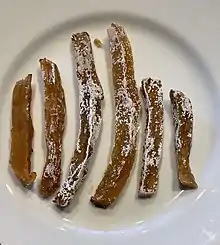 Hoshiimo (干し芋) is a sweet potato snack popular in Japan similar to a number of other dried foods in Asia. This food generally consists of steamed, dried, sweet potatoes that are skinned and sliced with no artificial sweeteners added. In some cases, the sweet potatoes may be roasted rather than steamed. The surface may be covered with a white powder. Not to be mistaken for mold, this is a form of crystallized sugar that emerges as the sweet potatoes dry.[1] With a chewy texture and sweet potato flavor, this food can be eaten raw or roasted. This dish is particularly rich in vitamins A, B1, C, and E and contains much potassium and calcium as well as dietary fiber. As an alkaline food, reputedly it helps the body maintain a healthy pH balance. [2] [3] [4]