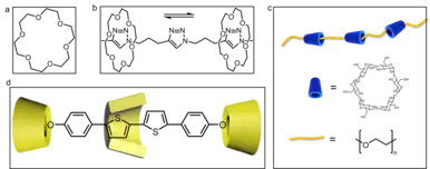 Cyclodextrin (CD) is composed of several glucose units and connects by ether bonds. There are three kinds of CDs, α-CD (6 units), β-CD (7 units), and γ-CD (8 units). The heights of the structure are all around 8 Å, while the cavity sizes of them are different, around 5, 6, and 8 Å, respectively. By comparing the size of the guest molecule and the CD, the binding behavior can be predicted. For instance, if the guest molecule is larger than the CD, it can be assumed that the binding will not occur. Typically, the α-CD can thread onto one PEG chain, while γ-CD can thread onto 2 PEG chains. β-CD can bind with thiophene-based molecule.[8]