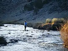 As Mammoth Creek leaves the Sierra and flows east into the Long Valley Caldera it is joined by warmer water from geothermal springs at the Hot Creek State Fish Hatchery. From this confluence the stream is named Hot Creek, though its water temperature seldom exceeds 68 °F (20 °C) until it reaches Hot Creek Gorge, 8 miles (13 km) east of Mammoth Lakes.[3] In the Hot Creek Gorge, numerous hot springs near and in the stream bed add hot water into the stream. Its mouth is at the confluence with the Owens River upstream from Crowley Lake.