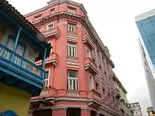The Hotel Ambos Mundos (Spanish pronunciation: [oˈtel ˈambos ˈmundos], Both Worlds Hotel) is a hotel in Havana, Cuba. Built with a square form with five floors, it has an eclectic set of characteristics of 20th-century style architecture. It was built in 1924 on a site that previously had been occupied by an old family house on the corner of Calle Obispo and Mercaderes (Bishop and Merchants Streets) in Old Havana.[1] It is a frequent tourist destination because it was home to the popular writer Ernest Hemingway for seven years in the 1930s.[2][3]