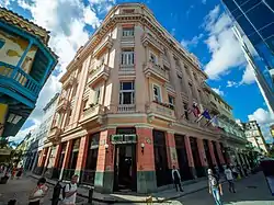 The Hotel Ambos Mundos (Spanish pronunciation: [oˈtel ˈambos ˈmundos], Both Worlds Hotel) is a hotel in Havana, Cuba. Built with a square form with five floors, it has an eclectic set of characteristics of 20th-century style architecture. It was built in 1924 on a site that previously had been occupied by an old family house on the corner of Calle Obispo and Mercaderes (Bishop and Merchants Streets) in Old Havana.[1] It is a frequent tourist destination because it was home to the popular writer Ernest Hemingway for seven years in the 1930s.[2][3]