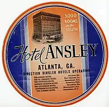 In 1952 the property was sold to the Dinkler hotel chain (once boasting "3000 Rooms in Southern Hotels") and was renamed the Dinkler Ansley,[4] and later in 1953 (40 years after its construction) renamed again to the Dinkler Plaza Hotel.[5] Hotel Ansley was the second downtown Atlanta hotel purchase for Dinkler Hotels (the first being the Kimball House (Atlanta) Hotel),[6] and it was here that the Dinkler corporate office was based.
