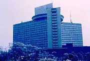 Construction of the hotel was requested by the Japanese government in the early 1960s, in order to fill a perceived shortage of hotel space for foreign visitors to the upcoming 1964 Summer Olympics. Yonetaro Otani, a former sumo wrestler who founded and ran a small steel company, agreed to build the hotel on a site he owned.[1] It had formerly been the site of the Fushimi-no-miya family residence in the Kioicho district of Tokyo (and before that, the residence of samurai lord Katō Kiyomasa).[2] The 1,085-room hotel was built in seventeen months using a number of techniques that were revolutionary in Japan at the time, such as curtain walls and prefabricated unit bathrooms. The 400-year-old garden on the site was retained as part of the hotel.[1] The hotel was first announced under a management contract with Sheraton Hotels as the Otani-Sheraton Hotel.[3] However, by the time of its completion, the arrangement was no longer in place,[lower-alpha 1] and the hotel opened as The New Otani on 1 September 1964, to coincide with the Olympics the following month.