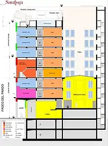 Like most businesses in Cuba in the 1960s, the Hotel Saratoga was confiscated by the revolutionary government.[3][lower-alpha 1][8] Until then, the building had maintained its vitality. After the takeover by the revolutionary government, it became a tenement building with multiple subdivisions until it was vacated due to its poor condition.[3][lower-alpha 2] In 1996, the property was transferred to Hotel Saratoga S.A., a Cuban joint-venture company owned jointly by Habaguanex S.A., the commercial arm of the City Historian's Office, and an international consortium of investors. The original building was gutted, and only the street façades on Paseo del Prado and Dragones remained. A new building was constructed behind the original façades, including a two-level basement, a mezzanine level, and additional floors. It was reopened in 2005 as a five-star hotel with 96 rooms, three bars, two restaurants, a roof-top swimming pool, and a business center. Its architecture recalled the colonial era and had an eclectic character with a large number of elements of interest such as French carpentry, ceramics, and Cuban marble.[3] The two original facades were destroyed by the explosion.