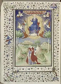 Master Boucicaut and his guild included scenes requested by the patron (Marshal Boucicaut). The martyrdom of St. Thomas was added to the book to illustrate the Marshal's distaste for the English.[1] The saints Master Boucicaut chose to include were chosen because the Marshal felt a connection to them.[1] Saints like Saint Leonard who was the patron saint of prisoners appealed to the Marshal, having been a prisoner twice before.[1] St. Michael appealed to the Marshal because he crusaded against evil to preserve the Christian faith as Michael smote the demon.[1] St. Catherine was the patron saint of a town for which the Marshal constructed a hospital.[1]