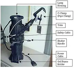 C-Clamps are hook clamps that use a threaded bolt to attach to a pipe or batten and to hold the instrument secure. Once secured, the fixture can be panned and tilted using adjustment knobs on the yoke and clamp.[2] In addition, safety cables (a loop of aircraft cable terminated with carabiners) are used to support the lighting instrument in case the clamp fails. A side arm is a metal pole bolted to the instrument with a clamp on the end. This enables the instrument to be hung to the side of an electric as opposed to below it.