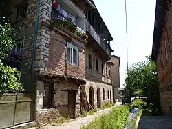 The house is considered to be a kind of palace.[1] The stone for the construction of the first floor was brought from Gorna Belica and processed on site. There is a ground floor where the shops (grocery and butcher) were located, and the living room, guest rooms and bedrooms were on the upper floors. On the top floor is the garage, which was used for day care during the summer. The house is divided into three parts with a central veranda,[1] On wooden beams bay windows are built with decoration characteristic of the area and a wooden fence. The ground floor is stone with brick decorations around the wooden windows that are closed with wooden shutters on the inside and metal grills on the outside. The entrance doors of the shops are wooden, with semicircular brick decoration in Medieval Roman style.[1] The upper floors are made of solid brick with wooden windows, also with brick trim, and here are the living quarters. The mezzanine construction is made with beams of chestnut tree. The roof structure is made of the same material, and the roof itself is on two pitches. The staircase that connects the floors is made of chestnut, as well as all the interior doors.[3]