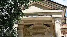 The house down the street of Schmidt, 10 in Taganrog, represents a one-story structure with the semi-basement room. It was constructed in the style of early classicism. The pediment has the triangular shape, as envisioned by the architect it is supported by 2 columns and 2 semi-columns which are created in the simplified Ionic-Corinthian style. On a trunk of a column vertical trenches – flutes are made. The entrance door is decorated with eaves of the small size with a beam pediment. Registration of a facade could be divided into three parts conditionally earlier. The central part is allocated with semi-columns with the molding located from above. Side parts of a facade of the building are framed with paired semi-columns and rectangular windows. The semi-basement floor contains windows and niches. After a reorganization of the building, some architectural details and elements were lost.[3]