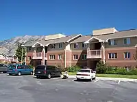 The current complex includes 30 buildings which originally housed married student families, until the end of the summer of 2006, when the southern half of the residential park was converted into housing for singles and eventually the entire complex.[43] In 2013 after the winter semester of school concluded, the northern portion of Wyview was converted into a makeshift Missionary Training Center (MTC) to help alleviate the overburdened Provo MTC just up the hill. As part of this temporary MTC complex, the LDS church also obtained a lease for the Raintree Apartments across the street to the west and both facilities are used together to house missionaries and their training activities.[44] The complex now houses both married and single students.