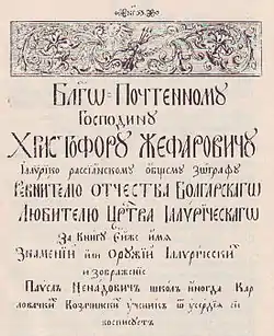 "To the well reputable gentleman Hristofor Zhefarovich, Illyro-Rascian universal icon-painter, zealot of Bulgarian fatherland, lover of Illyrian Empire"