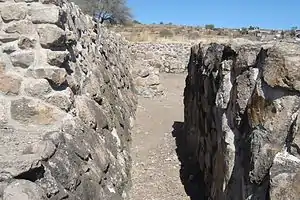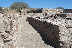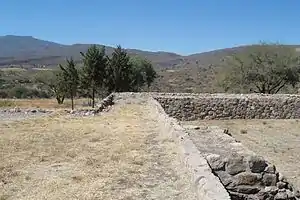 The explored part seems to indicate that the site was an administrative and religious center. It was built on a gentle hill slope, thus they had to build terraces with front retaining walls, to be able to level the ground and build constructions on them. Also such leveling forced the design and construction of water drainage channels. The presence of a sunken patio, as well as a construction of mixed plant (rectangular and circular) is an indication of a "yácata" (Tzintzuntzan); both constructions are samples of two different architectonic traditions, two cultural groups and two different time and space distributions. Remains of ancient housing units are underneath present day houses. This item needs to be confirmed.[1]