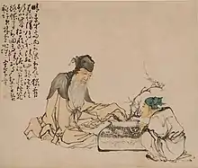 He began his training under the painter Shangguan Zhou (上官周).[1] In the earliest part of his career he excelled at cursive calligraphy and favored a meticulous style modelled after Ni Zan. He became better known as an artistic innovator who was one of the Eight Eccentrics of Yangzhou. When it came to paintings of people he favored images of religious, historic, and common people. His more famous works include The Drunk Monk and Shepherd Su Wu.