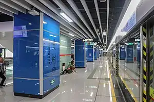 Huangcun station (Chinese: 黄村站), formerly Olympic Sports Center station (奥林匹克中心站) when planning, is an interchange station between Line 4 and Line 21 of the Guangzhou Metro, and also the terminus of Line 4. It is located at the underground outside Guangdong Olympic Stadium in Huangcun Subdistrict (黄村街道), Tianhe District.[1] It started operation on 25 September 2010. Line 4 linking the Asian Games New Town outside Haibang Station with Guangdong Olympic Stadium plays a major role in carrying passengers during the Guangzhou Asian Games.[2] The station became a transfer station with Line 21 on 20 December 2019. It is located near the Tianhe East railway station.