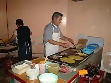 Huarache (sometimes spelled guarache; [waˈɾatʃe] ⓘ) is a popular Mexican dish consisting of masa dough with smashed pinto beans placed in the center before it is given an oblong shape, fried, topped with green or red salsa, onions, potato, cilantro and any manner of protein such as ground beef or tongue, then finished with queso fresco.[1] Huaraches are also often paired with fried cactus leaves, or nopales. This dish is most popular in its hometown of Mexico City and is also sold in cities with large Mexican-American populations such as Los Angeles, San Diego, Phoenix, Chicago, San Francisco, San Antonio, Dallas/Fort Worth, and Houston, but have yet to become widely available across the entire United States.[2] Still, huaraches and other Mexican dishes have increased their presence in the Midwest due to increasing numbers of Latinos in rural America.