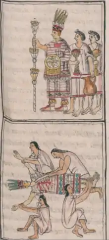 Dance played an important role in Tecuilhuitontli. Dancers arranged themselves in rows, and sang songs in a high tremble. Sahagún points out that their voices "rang like a bell".[9] While the women sang and danced, the men and elders directed the dancers. The dancers wore garlands of iztauhyatl, the flower artemisia, while those watching the festival carried the flower.[1] Song and dance in honor of Huixtocihuatl continued for ten days, and culminated on the last day of Tecuilhuitontli, when priests sacrificed the ixiptla on the shrine dedicated to Tlaloc on the Templo Mayor.[9] Dancers escorted the likeness of Huixtocihuatl to the temple. Captives, to be slain along with the ixiptla, also joined the procession to the temple.[1] Priests, adorned with quetzal feathers, slay the captives first.[9] Sahagún emphasizes the significance of the sacrifice of the captives. He wrote that the captives would be,