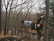 The human flag (known as an iron X in pole dancing)[1] is a feat of strength where the body is parallel to the ground supported by a vertical bar. A straight line is formed using the arms and body. The trick requires the performer to have extensive upper body strength.