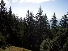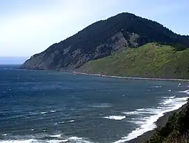Humbug Mountain is one of the highest mountains in the U.S. state of Oregon to rise directly from the Pacific Ocean. It lies on the state's southern coast, about 6 miles (10 km) south of Port Orford and 21 miles (34 km) north of Gold Beach. The mountain is completely within Humbug Mountain State Park, and U.S. Route 101 passes by its northern base.[3][4][5][6] Its slopes feature an old-growth temperate rainforest.[7] Two trails run from the state park campground to the mountain's summit, one 1.5 miles (2.4 km) long, the other 2 miles (3.2 km) long. Both are part of the much longer Oregon Coast Trail.[3][4][5] The area is popular with hikers, campers, cyclists, and whale watchers although biking and camping on the mountain itself are prohibited.[3][7][8]