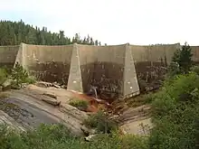 To create this reservoir, John S. Eastwood was hired in 1908 to construct a dam at Long Meadow.[2] Eastwood proposed constructing the world's first reinforced concrete multiple arch dam. Although unprecedented, at a cost of approximately $46,000, the dam's design was a less expensive alternative to a conventional rock fill dam that would have cost about twice as much to construct. The dam was completed in only 114 days, by the end of 1909, along with a mill immediately adjacent to the dam.[3] Logs were dumped into the reservoir by rail and floated to the dam where they were drawn up into the mill, cut and then dried in kilns next to the mill on the west bank of Tenmile Creek. From this location, lumber was floated to Sanger, California, in a flume filled with water from the reservoir. The flume was the longest ever created, eventually stretching 73 miles (117 km) from Hume Lake to Sanger.[4] Designed and built by James Carroll Goss, the flume was used by both the lumber company and tourists. Thrill seeking tourists would occasionally ride in the flume down from the Sierras in special boats designed with an open prow so that water would help keep the boats from flying off into the air. The flume was also reputedly utilized in 1893 by the bandit Chris Evans, of the Evans-Sontag Gang of Train Robbers, who hid along the flume to evade capture after escaping from the Fresno County Jail with his accomplice Ed Morrell.[5]